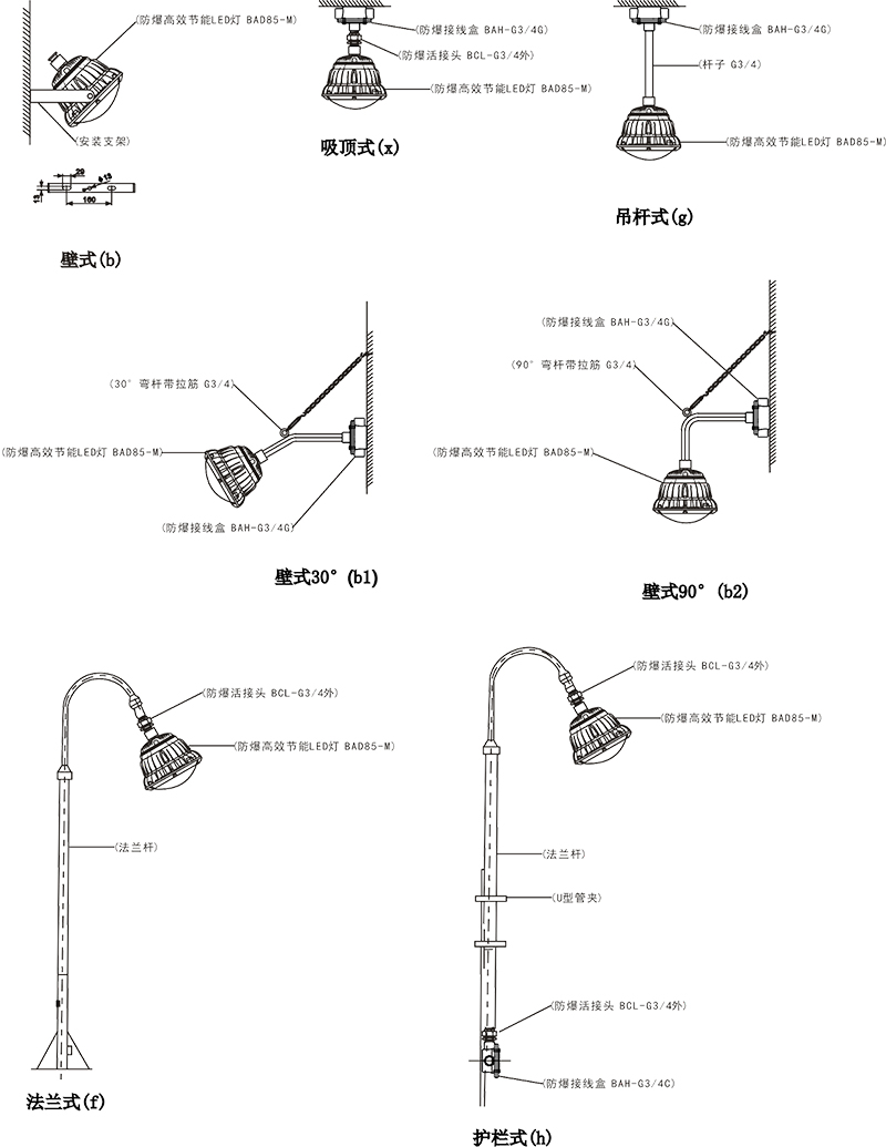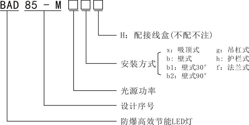 > 按照產品型號規格說明逐條選擇并注明防爆標志,例如:需要防爆高效節能 LED 燈 100W 規格,吸頂式安裝,則產品型號為 BAD85-M100x ExdembⅡCT5 Gb。