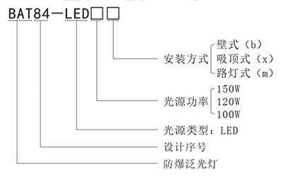 > ?按照產品型號規格說明逐條選擇并注明防爆標志,例如:需要防爆 LED 泛光燈 100W 規格,則產品型號為 BAT84-LED100;
