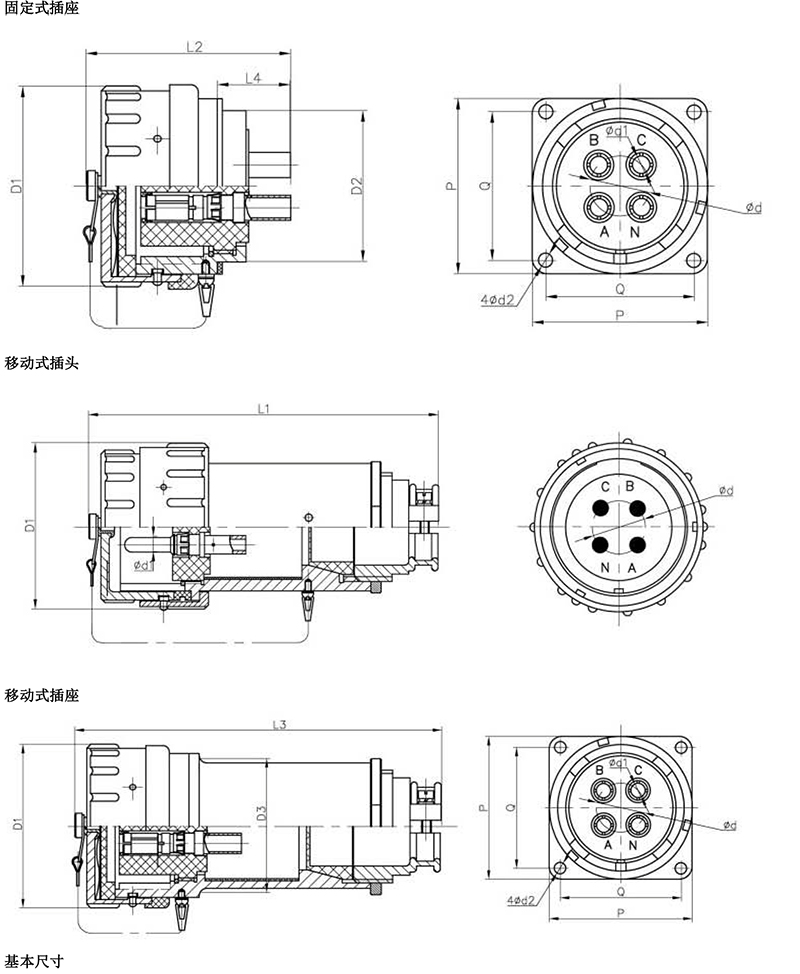 YT-GZ-4/100 | 100A/400V/500V | 3P+N | 100A 固定式三相五極插頭插座 |