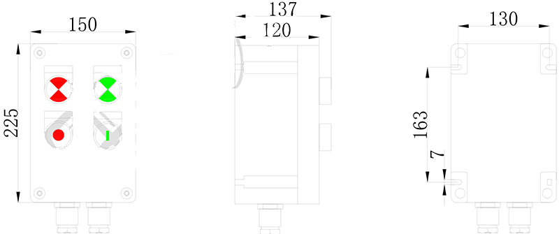 * 控制箱有增安型外殼,防爆元件(按鈕、電表、指示燈、開關)及接線端子等組合;