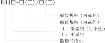 > 按照產(chǎn)品型號(hào)規(guī)格逐條選擇并注明防爆標(biāo)志,例如:需要隔爆型碳素鋼一內(nèi)一外 G3/4″螺紋防爆活接頭,則產(chǎn)品選型為 BHJ- G3/4(內(nèi))/ G3/4(外) ExdⅡC
